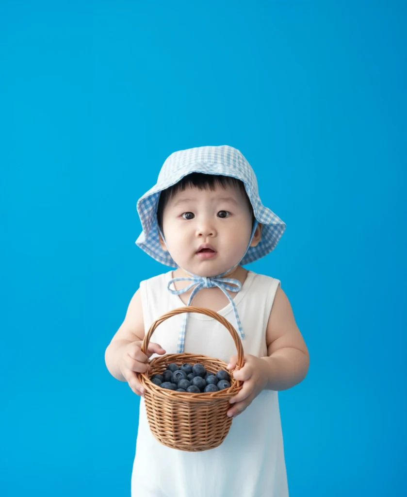 Adorable baby portrait, waist-up, wearing a light blue checkered bonnet and white sleeveless romper, baby holding a basket of blueberries against chest, vivid blue seamless studio background, soft studio lighting with gentle highlights, photorealistic, glowing baby skin, cinematic color grading, 85mm lens, shallow DOF, HDR