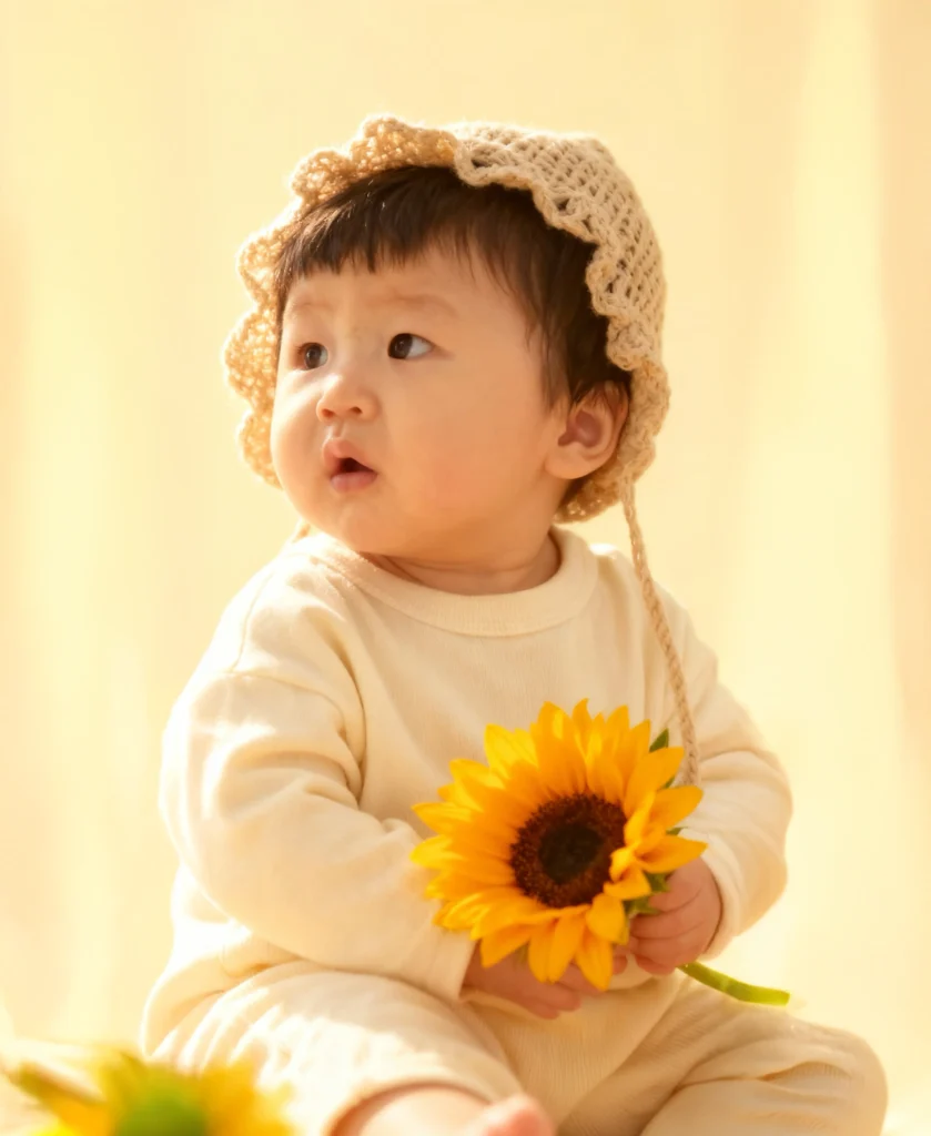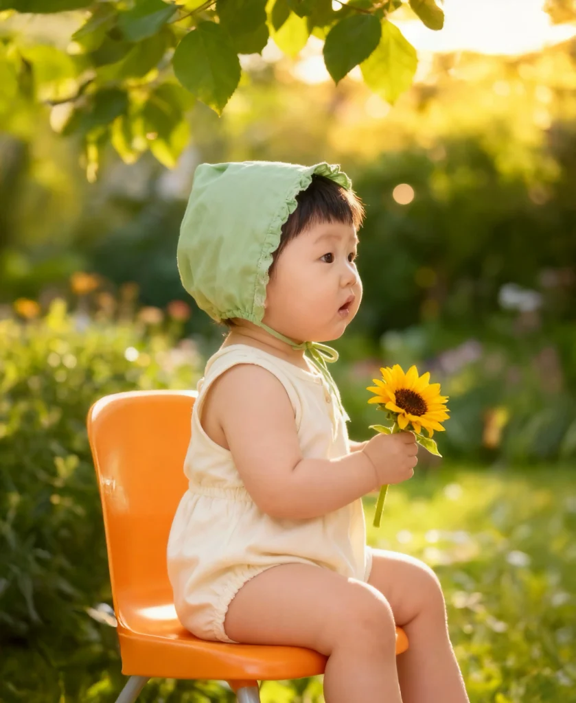 Baby side profile portrait, waist-up, wearing a light green bonnet and cream romper, baby holding a small sunflower, soft golden daylight, blurred outdoor garden background with green leaves and bokeh, photorealistic cinematic tones, 85mm lens, HDR