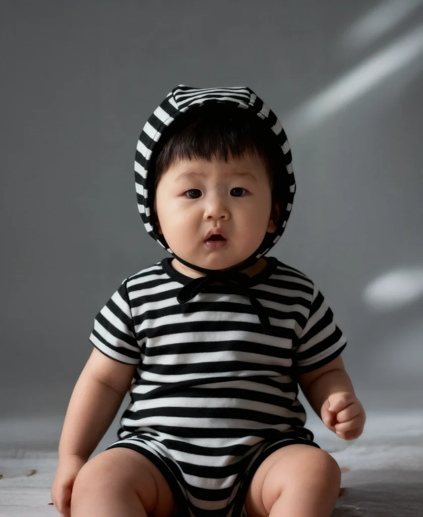 Stylized baby portrait, waist-up, wearing a black-and-white striped bonnet and matching romper, minimalistic gray seamless studio background, dramatic cinematic lighting with soft highlights, photorealistic fine art style, HDR, ultra detailed, shallow depth of field, 85mm lens