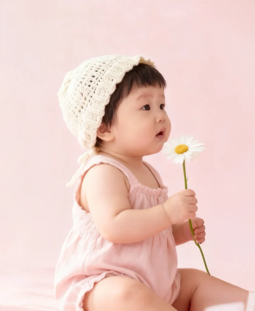 Side profile baby portrait, chest-up, wearing a cream knitted bonnet and soft pastel pink romper, baby gently holding a daisy flower, natural daylight studio setup, pale pink background, photorealistic, dreamy cinematic tones, HDR, shallow depth of field, 50mm lens