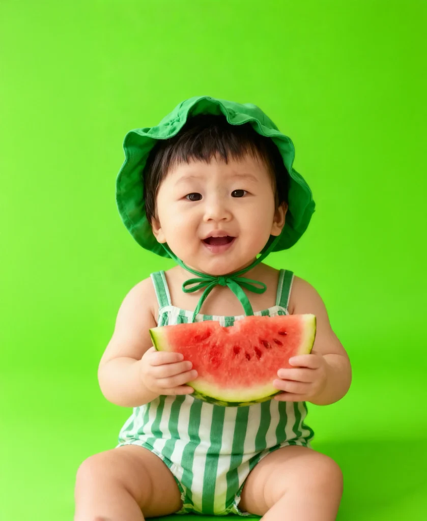 Adorable baby portrait, waist-up, wearing a green bonnet and striped summer romper, baby smiling while holding a slice of watermelon, bright fresh green seamless background, summer-inspired studio lighting, photorealistic, cinematic vibrant tones, HDR, ultra detailed, 85mm lens