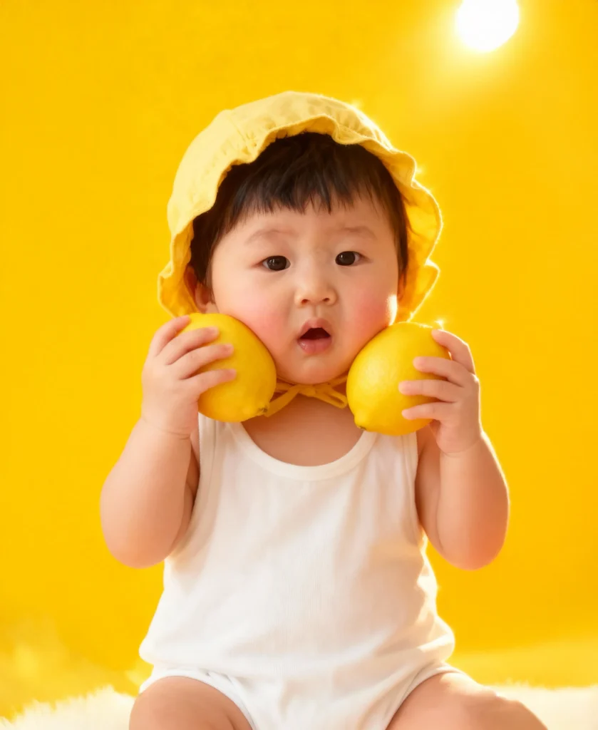 Baby portrait, chest-up close-up, wearing a soft yellow bonnet and white sleeveless romper, baby holding two lemons against cheeks, vivid yellow seamless background, glowing studio lighting, photorealistic details, rosy skin, cinematic grading, HDR, 85mm lens, ultra sharp focus